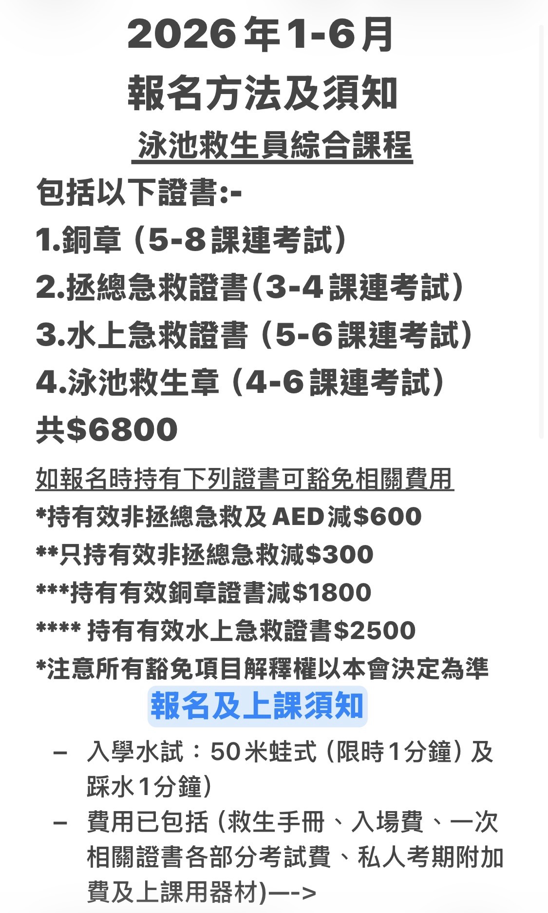 2026年泳池救生綜合課程包括以下4個章別