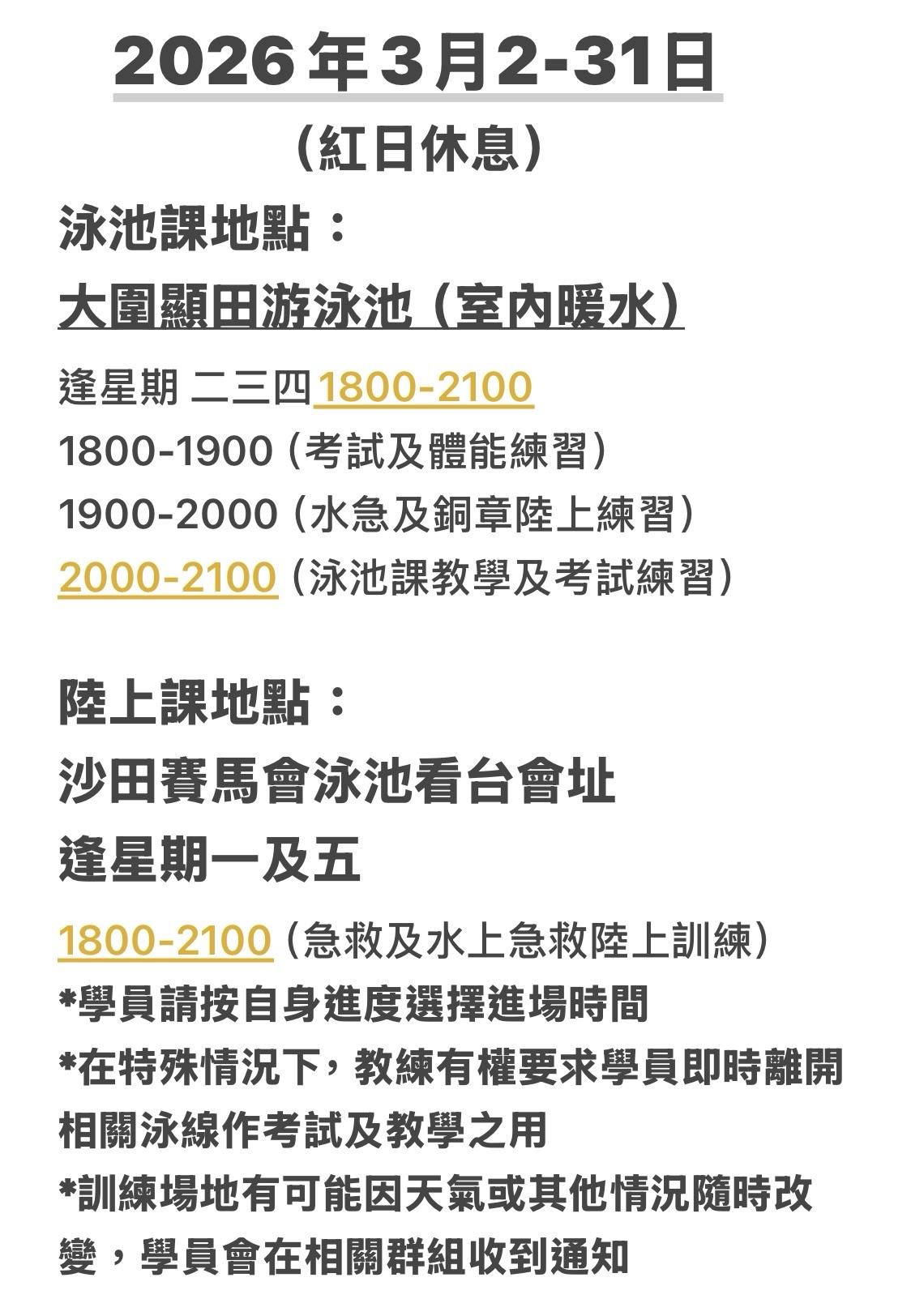 *除泳池救生外,考試同樣於訓練時間內進行,